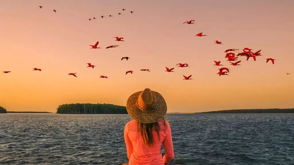 Entre os destaques mais celebrados está a famosa revoada dos guarás, quando centenas de aves vermelhas retornam aos seus dormideiros ao pôr do sol, tingindo o horizonte com tons intensos de vermelho fogo. Além deles, é comum observar garças, maçaricos, colhereiros, falcões, socós e até espécies mais raras que utilizam o delta como ponto de descanso em rotas migratórias internacionais. A grande variedade de ambientes permite que cada passeio revele algo novo, tornando a experiência única a cada visita.